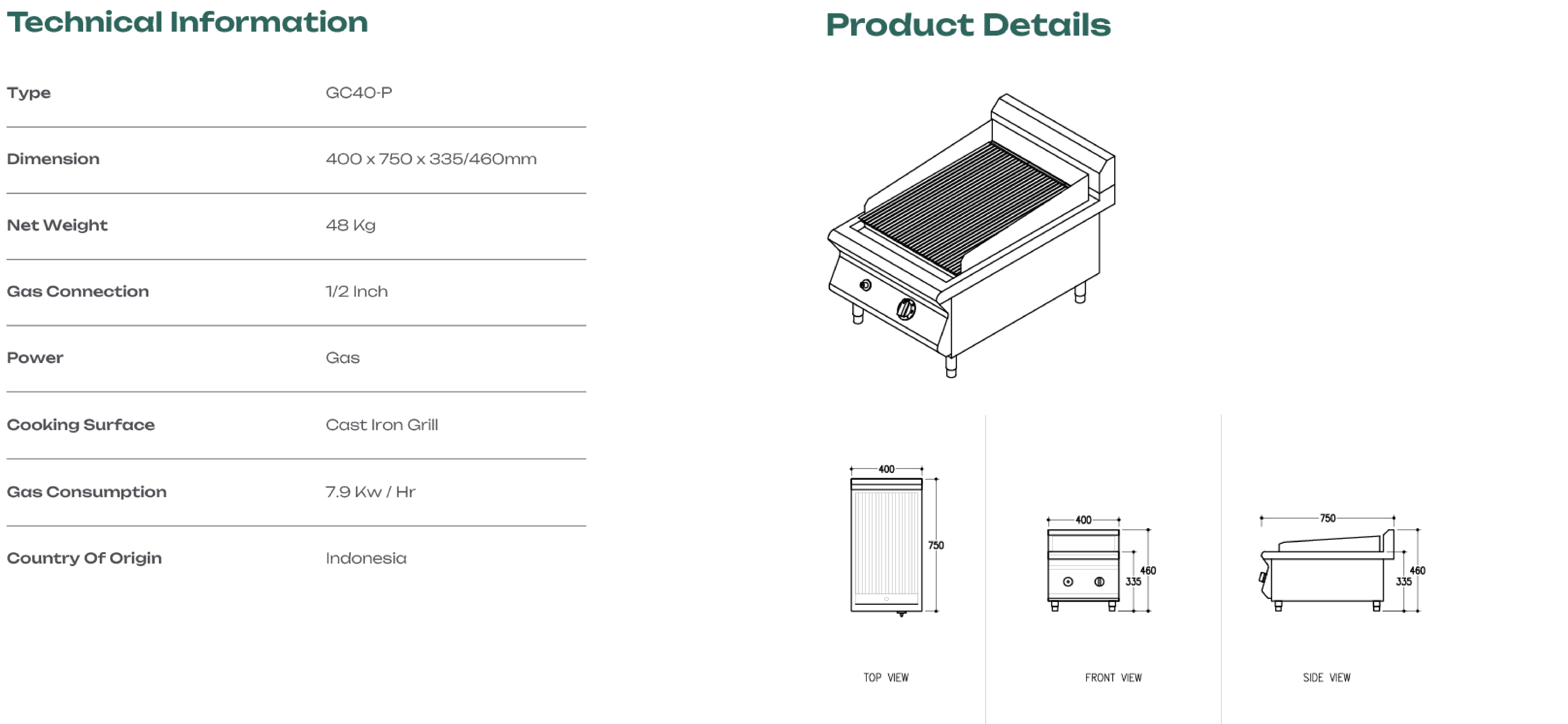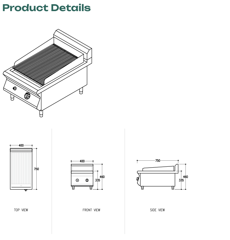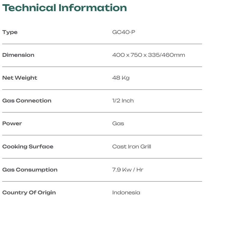 Make the most out of your valuable countertop space with this Portable Gas Charcoal, it easily prepares high volumes of sizzling steak, juicy hamburgers, mouth-watering ribs, and smoky shish kabobs to satisfy your hungry patrons. Its high-performance burners provide superior heat distribution below the extra high heat and fl ame-fl are of the innovative volcanic stone. powered with Cast Iron Burners. Thick Cast Iron Grill with Slanted-Angel and Oil. Channel for easy cleaning and durability. Equipped with Flame Failure Device, Ignitor Piezzo, adjustable Leveling Feet and comes with numerous types.