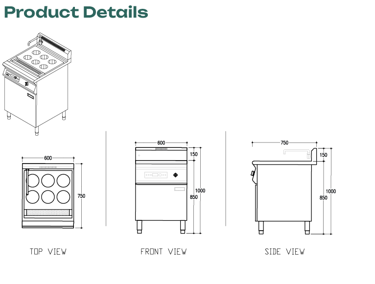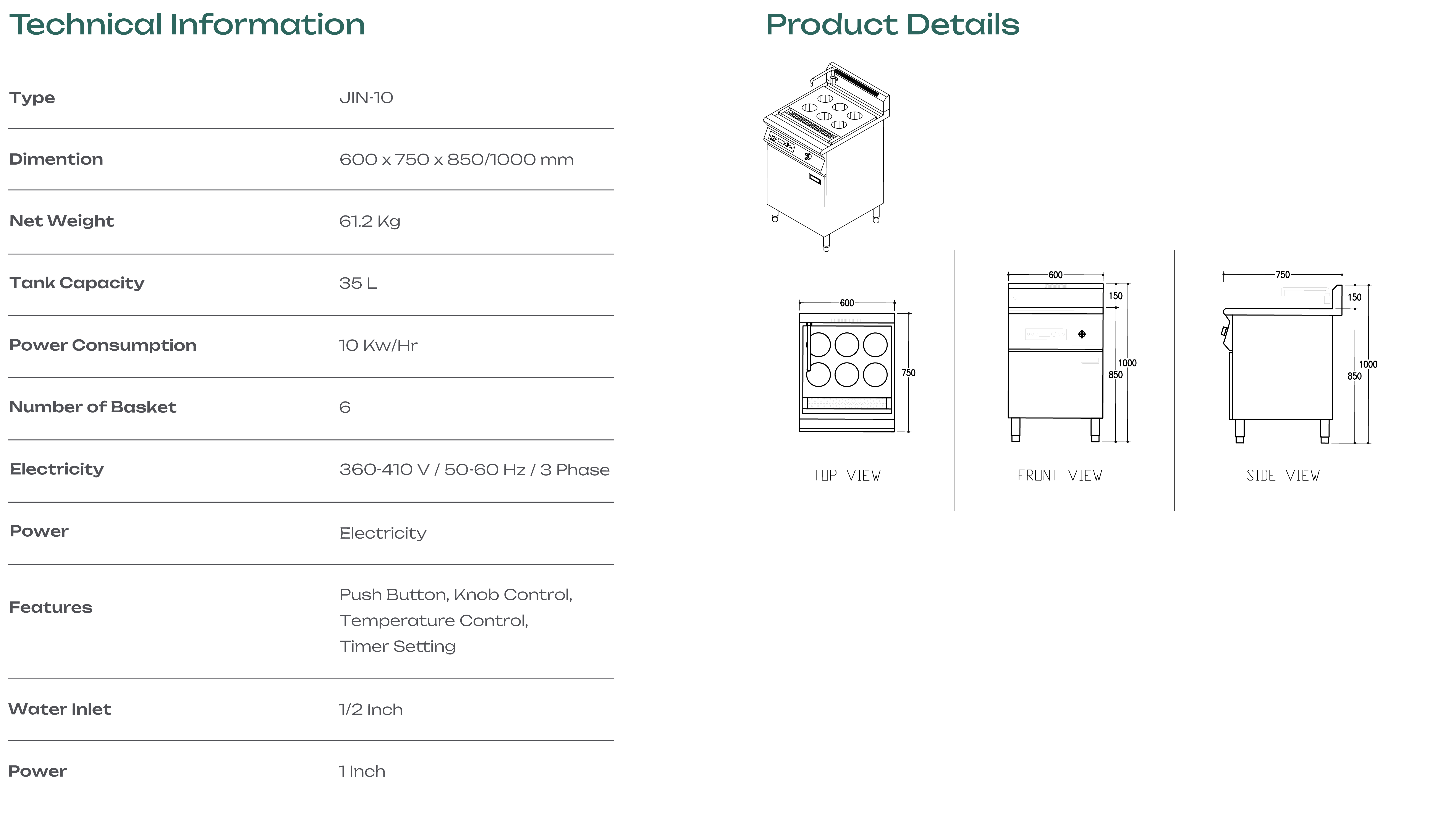 Cooking noodle or pasta made easy with this device. Consistently producing high quality pasta / noodle what is delicious and al dente. Equipped with digital control panel, LED Display and knob for easy usage. This device is also build with water faucet for easy water supply and effi cient water disposable system. This device also come with automatic heat sensor to control your water temperature inside the tank .